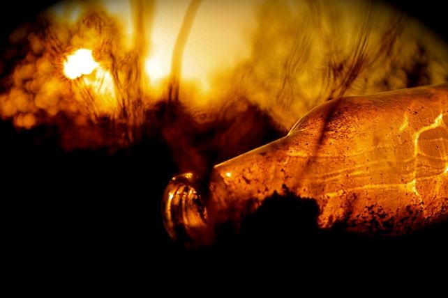Empty bottle reflecting the last bit of sinking sun on the vast Nullarbor Plain - Western Australia.
