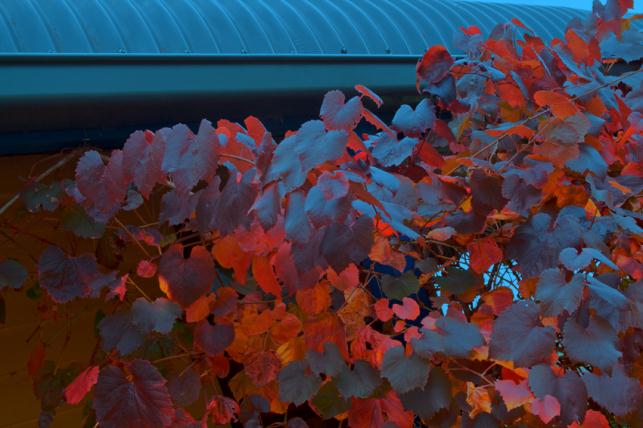 A canopy of autumn leaves covering a veranda on a farm property. I have added an abstract feel to it by adding touches of blue to offset the red.