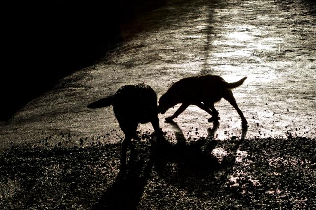 In an outside lane, barks are heard and a rubbish bin is knocked over.