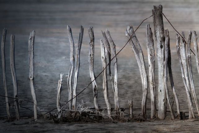 Remnants from an old fence stretching across a salt flat near the Coorong National Park - South Australia.