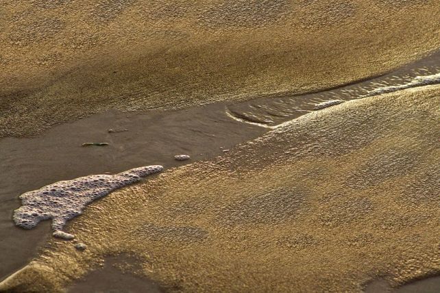 Close up of water flowing between two small sand banks off the main beach area. East Coast Tasmania - Australia.