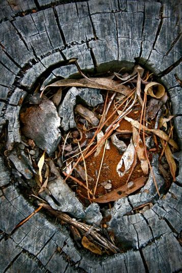 This title is a play on the words 'Stamp Collection' This stump is only a few centimetres above the ground, so it's very easy for things to blow into it. Every time I go past it, there is a different collection of odds & ends caught in the crevices.