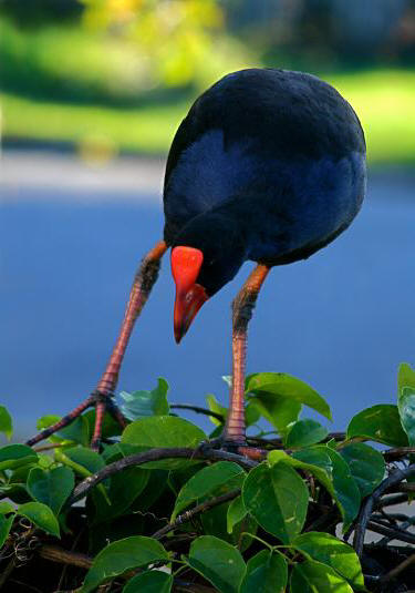 A Purple Swamphen paying a visit on top of a friend's fence in Queensland. For such a bulky bird, the Swamphen is an accomplished flier and are proficient swimmers, but prefer to wander on the edges of water, amongst reeds and floating vegetation.