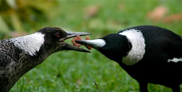 Australian Magpies feeding. Mother & baby. Captured in my Auntie's garden. My auntie loves birds. Here they are with some meat my Auntie gave them.